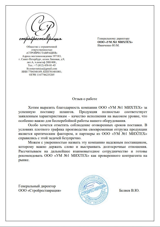 Хотим выразить благодарность компании ООО «УМ No1 МИХТЕХ» за успешную поставку шлангов. Продукция полностью соответствует заявленным характеристикам – качество исполнения на высоком уровне, что особенно важно для бесперебойной работы нашего оборудования. Особо хочется отметить соблюдение оговоренных сроков поставки. В условиях плотного графика производства своевременная отгрузка продукции является критическим фактором, и партнеры из ООО «УМ No1 МИХТЕХ» справились с этой задачей безупречно.